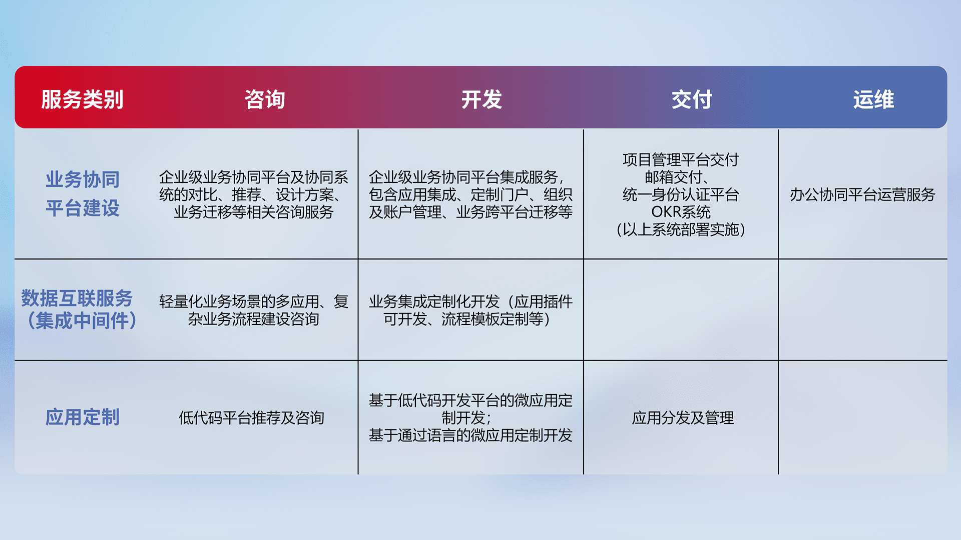 针对钉钉、、、、企微、、IDaas等平台级产品提供产品的规划、、、方案、、、交付、、、定制化开发等服务,,实现如统一协同办公、、智能客户服务、、混合会议管理、、、、智能数据查询、、、等业务场景,,实现数字化转型。。