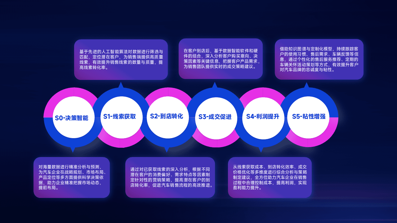 通过拓宽潜在客户来源、、优化线索分配并提高到店转化率,,,,以增强销售效率。。。同时,,,利用线索数据不断优化分析模型,,,有效提升转化率,,,扩大营销影响力。。